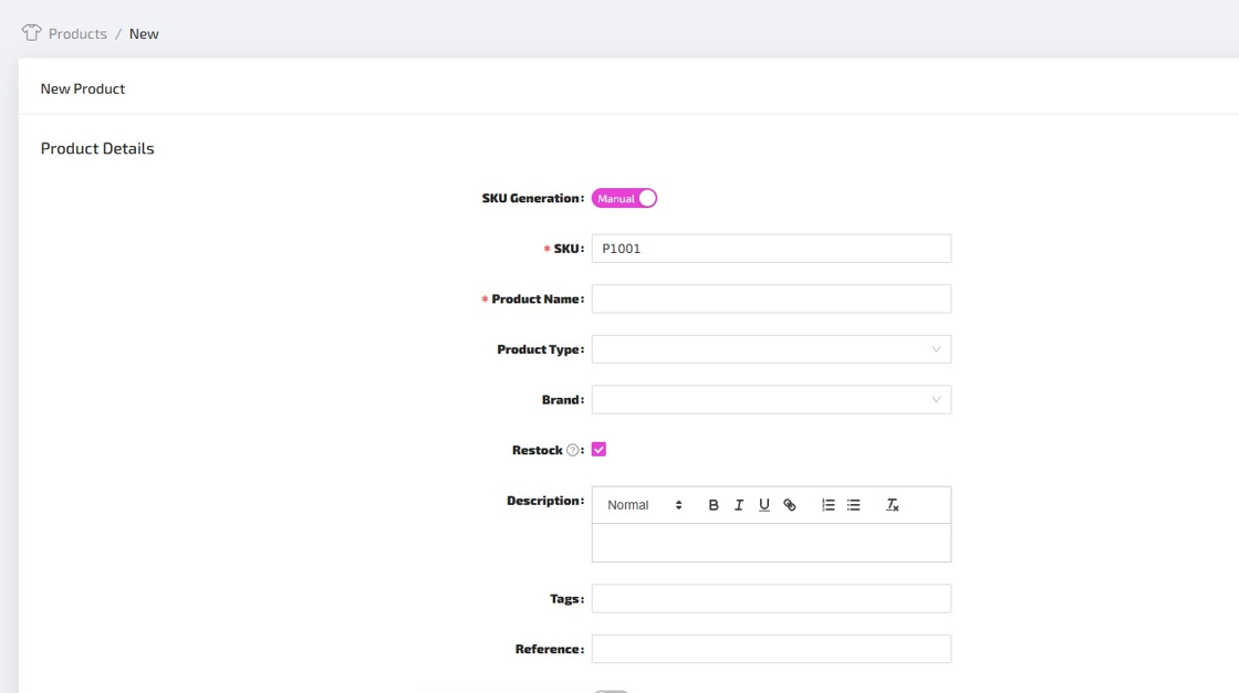 SKU Generation - This is set to "Automatic" by default, which means that a unique product SKU will be automatically generated for your new product. You can switch this to "Manual" if you would prefer to type in the SKU for your new product manually. NOTE: You can customise automatic SKU generation via Settings > Configuration > Custom IDs.