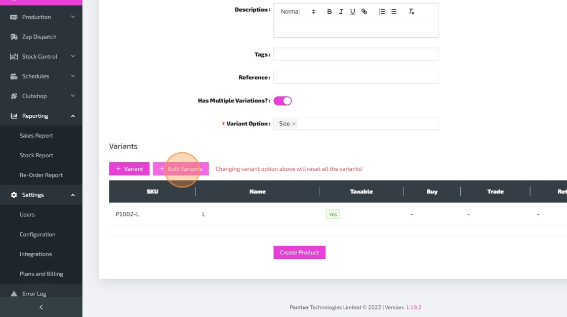 - NOTE: Although Panther does support multiple Variant Options per product, (e.g. your product could have both Size and Colour as variant options, with a variant for every combination of Size and Colour that you offer), we strongly recommend that you only have one Variant Option per product, otherwise product management can get very complicated. In addition, some Sales Channels and other integrations might not support multiple variant options.