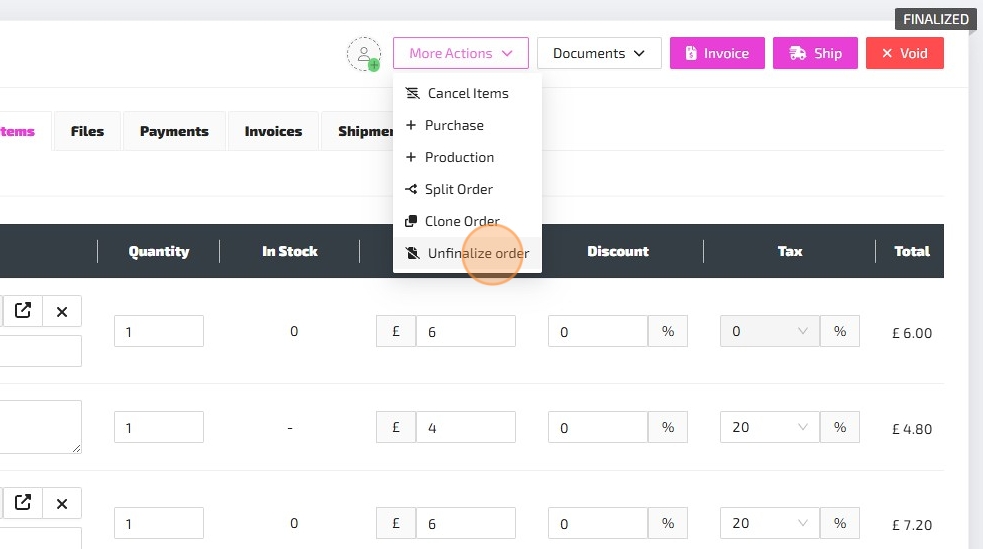 Sales Orders must be Finalized before they can be Invoiced or Shipped. Finalizing a Sales Order is essentially a way of showing that all items have been added and no more amendments are expected. Finalization can be a way to flag the Sales Order up to your team as being ready for picking and/or production. Depending on your business and workflows, you might decide to only Finalize Sales Orders after they have been paid for or after they have been approved by the customer, etc. If you are using custom Order Stages, you can enforce rules to prevent Sales Orders from being Finalized until the Sales Order has reached a certain Order Stage.