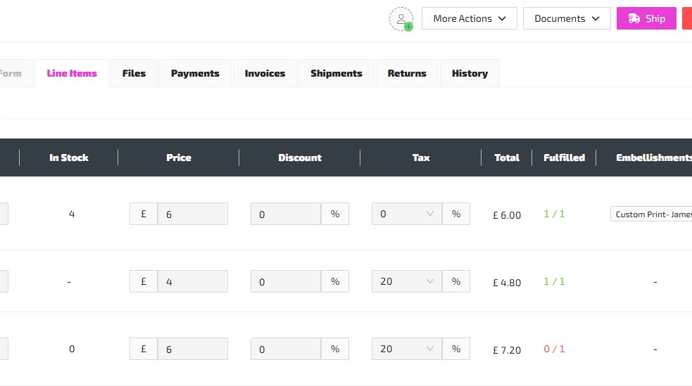 To Ship - This field allows you to enter the Quantity of this Line Item that you would like to Ship. This will be set automatically to match the Outstanding column (if current stock holding allows), but you can change it manually per Line if needed. For Products/Variants with Manage Stock enabled, you cannot Ship more than you have in stock. NOTE: The Max/Min switch in the column header can be used to toggle between Shipping the maximum quantities and Shipping quantities of 0. This can be useful in cases where you have lots of Line Items, but only want to Ship a few of them.